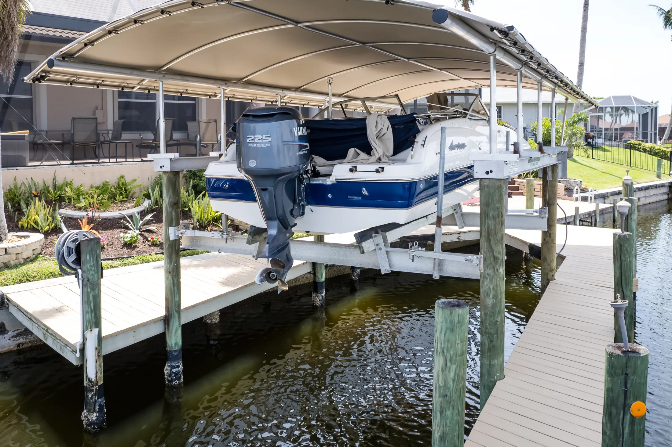 When it’s time to deploy the Boat Lift Lock, raise your lift to its highest position and lock the stationary arms into place with the drop pin. Slide the adjustable arms into position and lock them into place with the patent-pending turnbuckle. This creates the structural support for your lift.